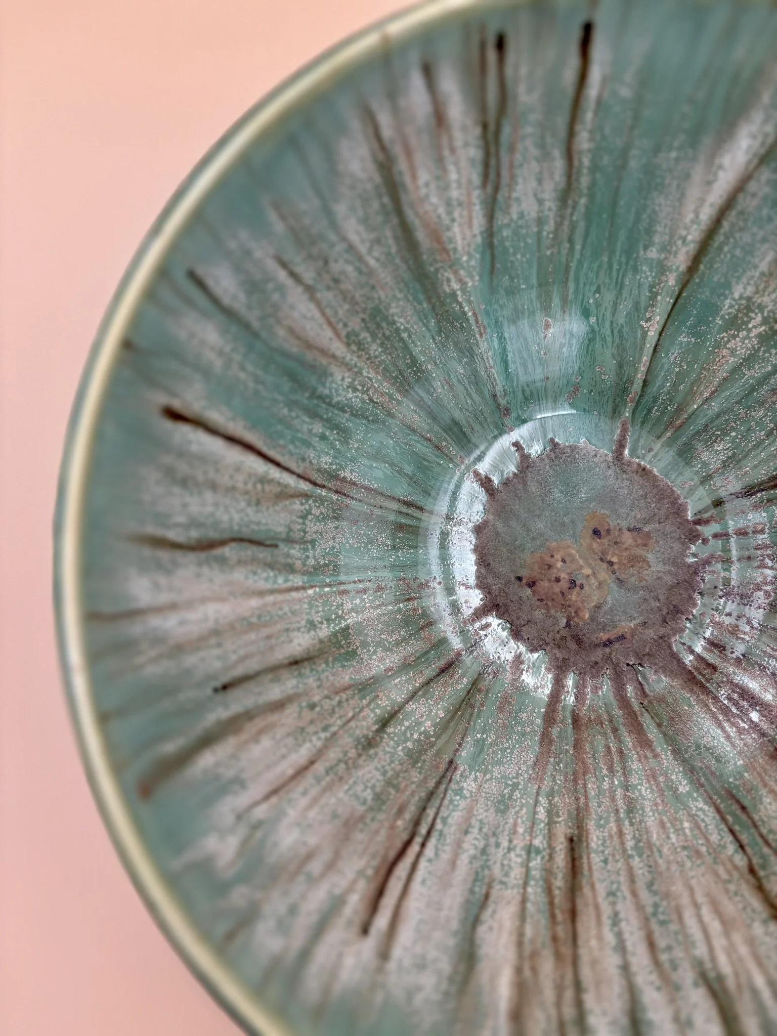 Wide shallow hand-made wheel thrown green porcelain bowl detail