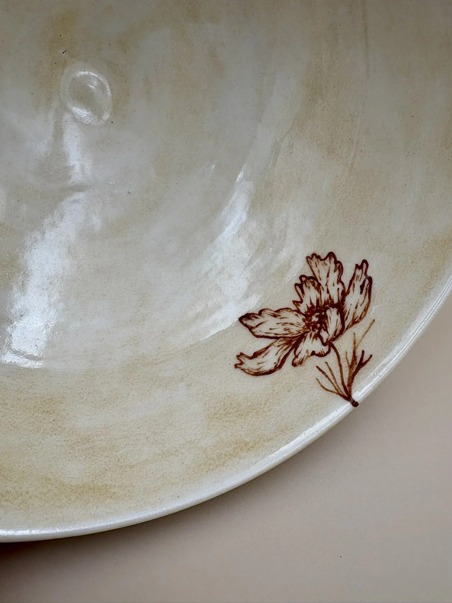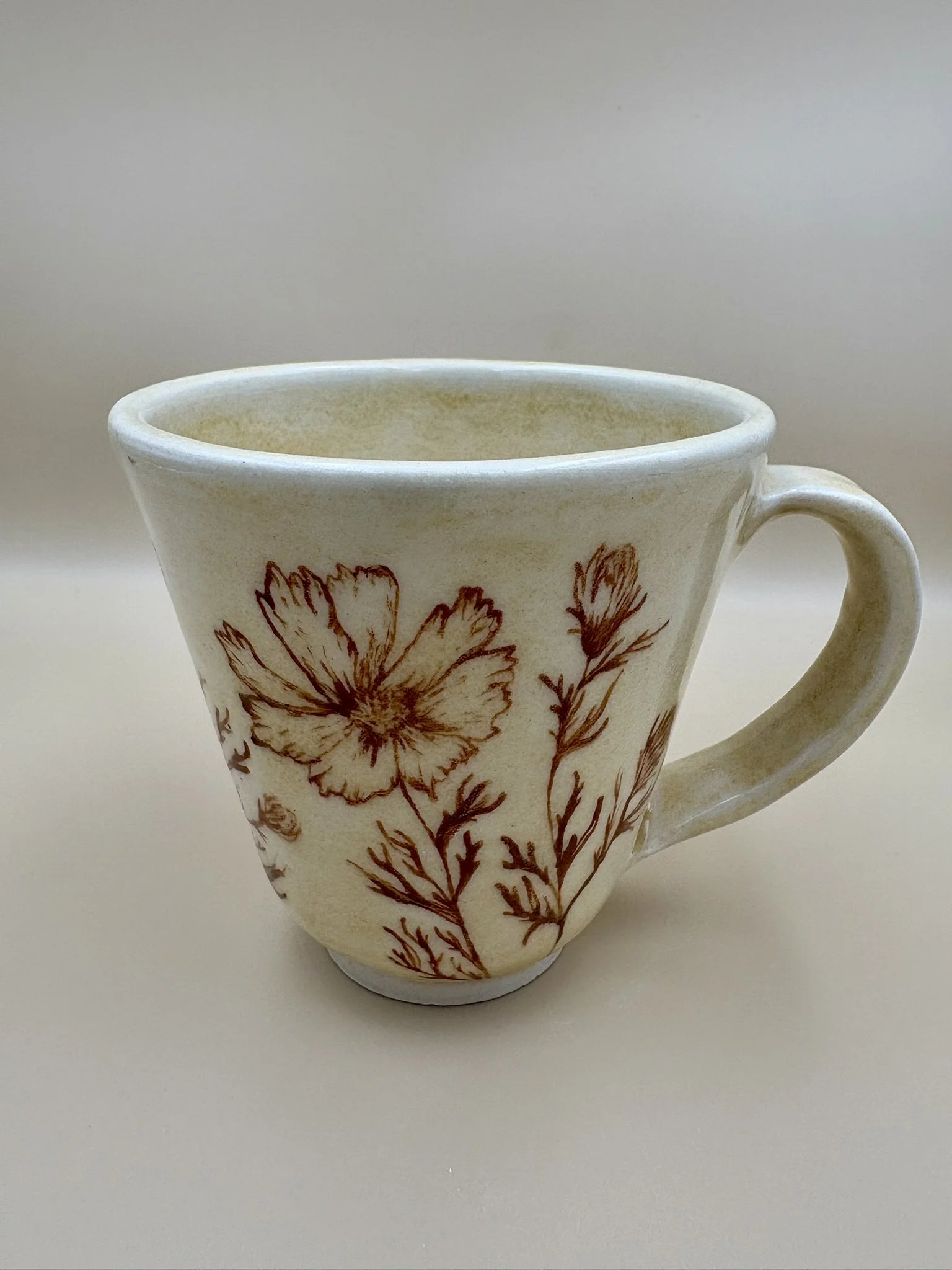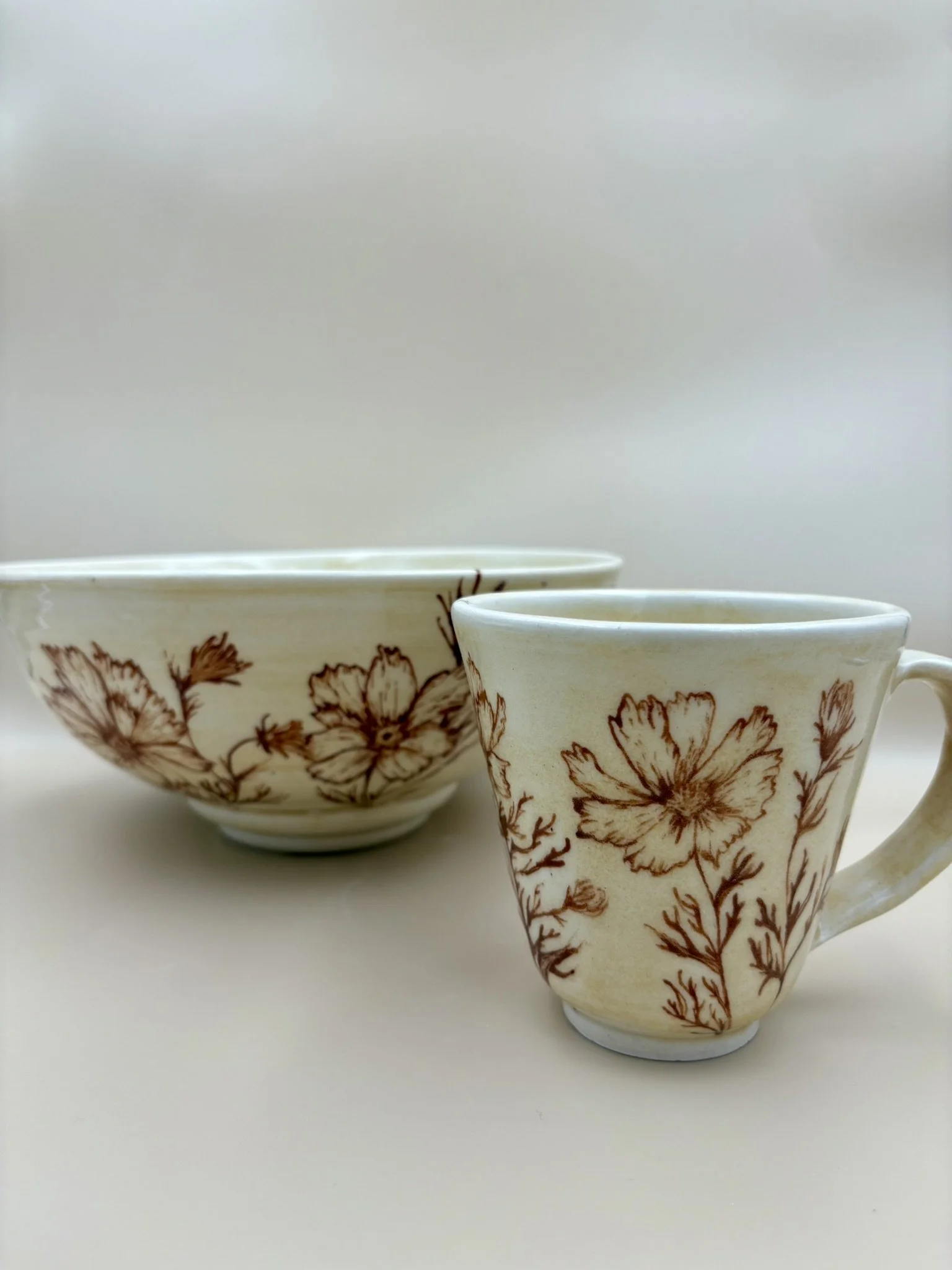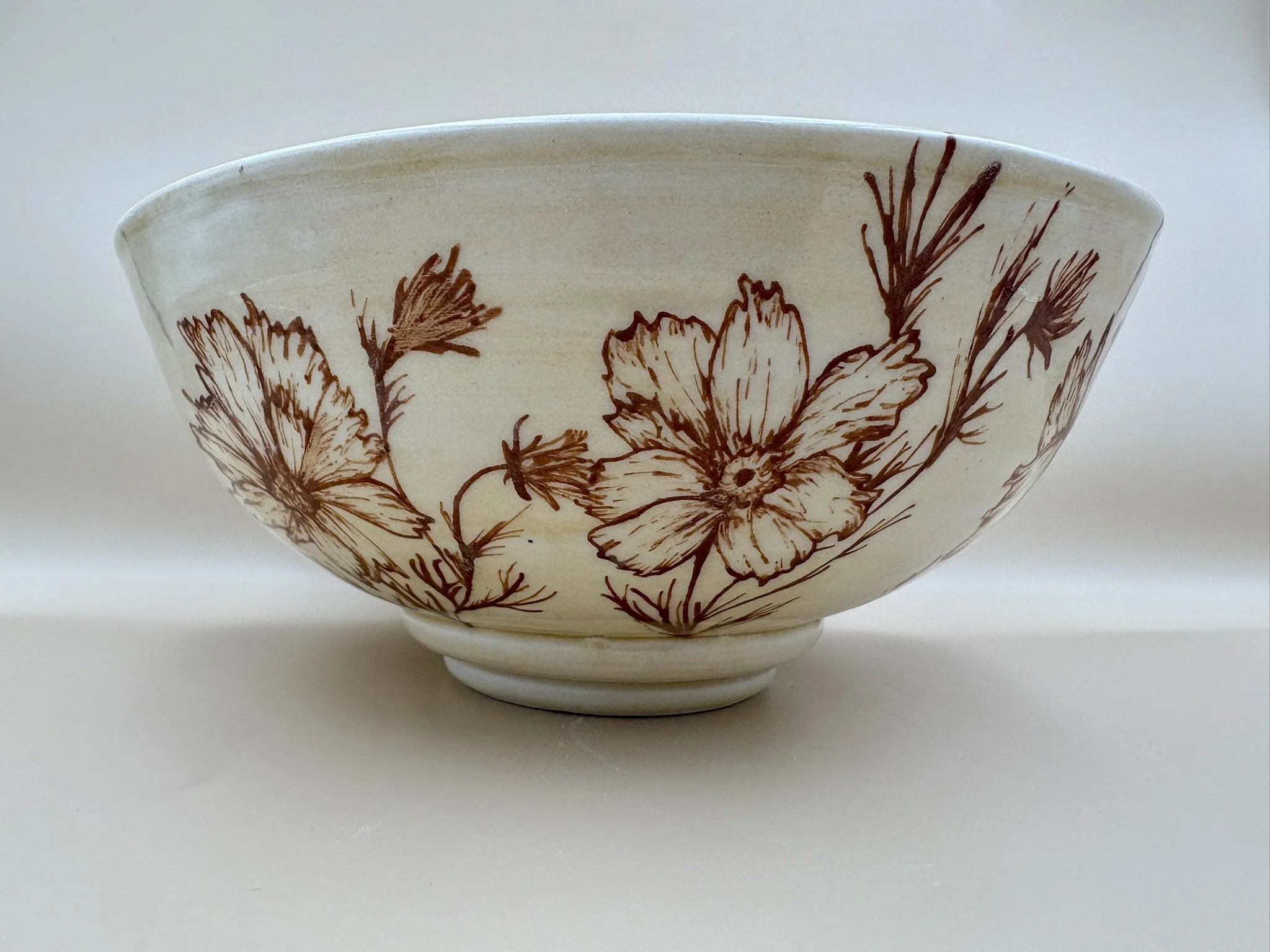 Porcelain freehand drawn wheel thrown pottery cosmos flower detail ceramics